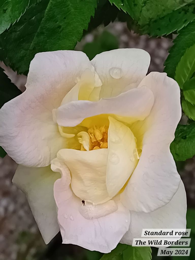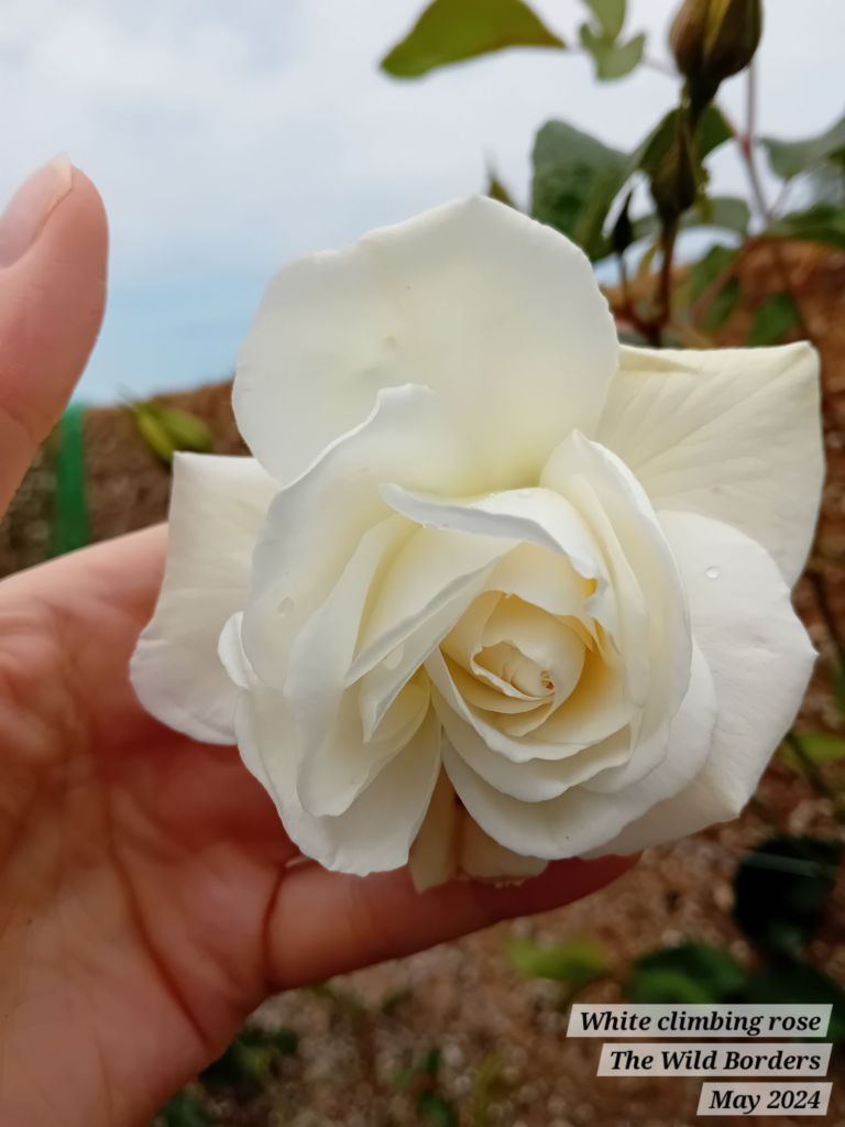 The white rose is located to the far left of the border near to the seating area and is highly scented. I discovered from looking at it this month that it has a soft pink tinge to its outer petals and some interesting splashes of pink: