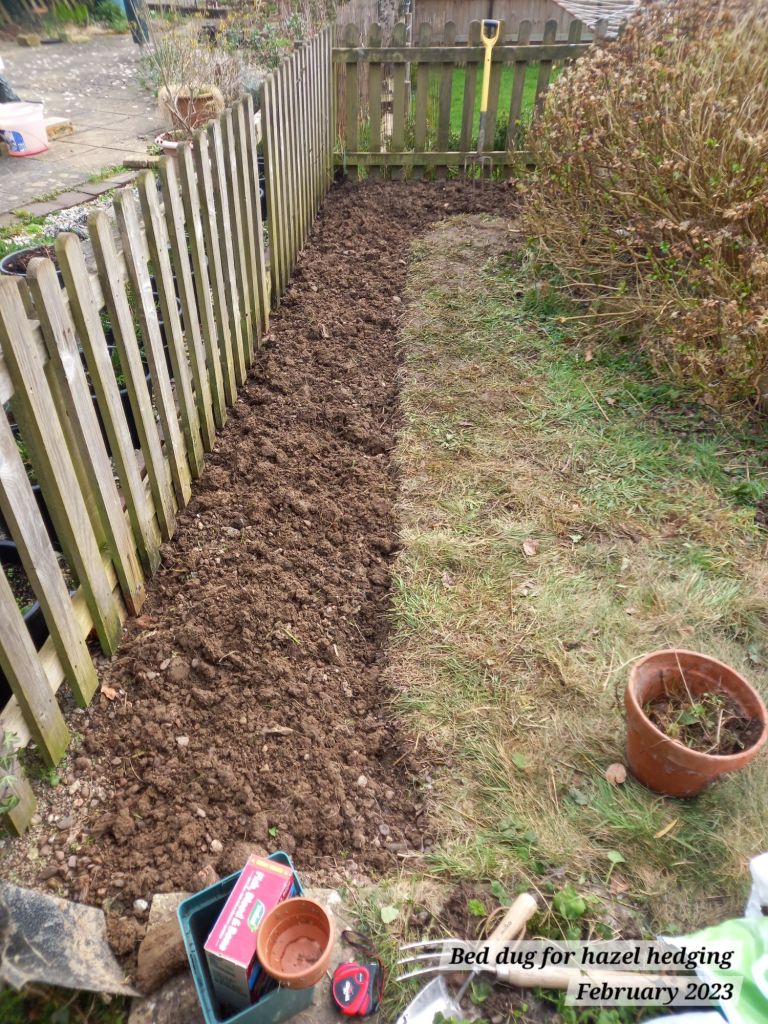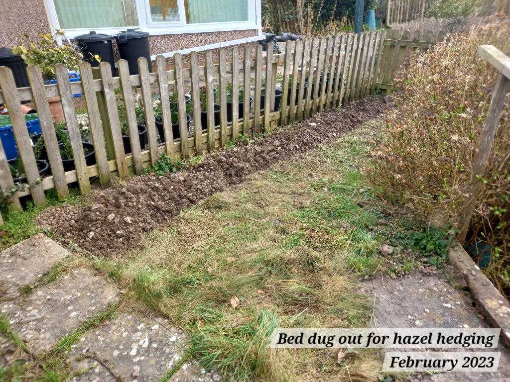 In February 2023, I dug out a long bed all around the edge of the grassed area and planted a bare root hazel hedge.
