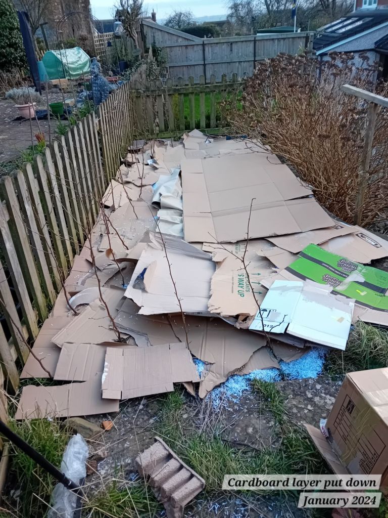In January 2024, we laid down some shredded paper (which I have in abundance from my job role), with generous layers of cardboard on top of that and then a thick layer of bark mulch on top. We had plenty of cardboard boxes to recycle from our move into the property, so it was an ideal solution: