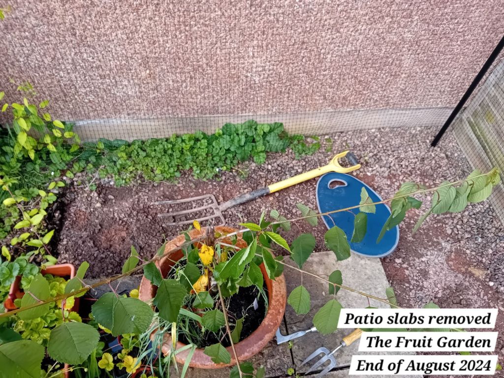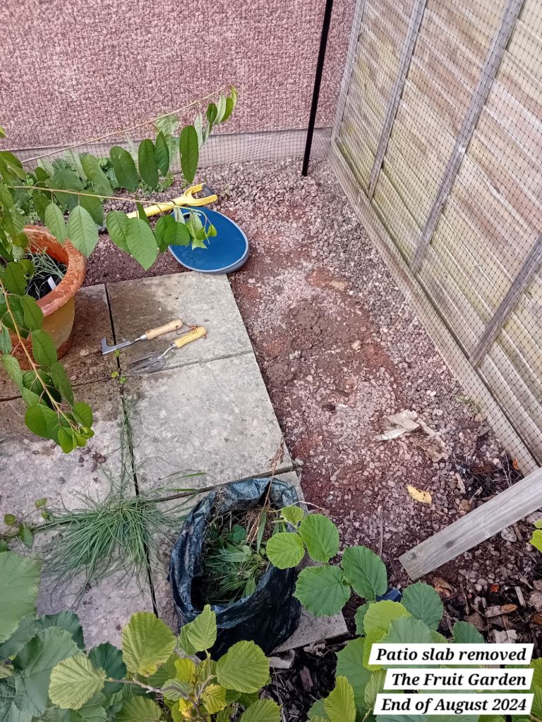 To start with, I removed a line of paving slabs on the sides of the patio nearest to the wall and the fence. This is to allow the fruit trees to be set away from the fruit cage. I will have to install some structural support for the fruit trees. but that isn’t an urgent job right now.