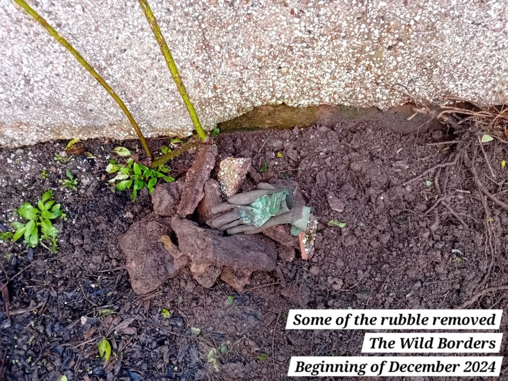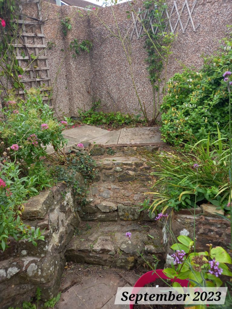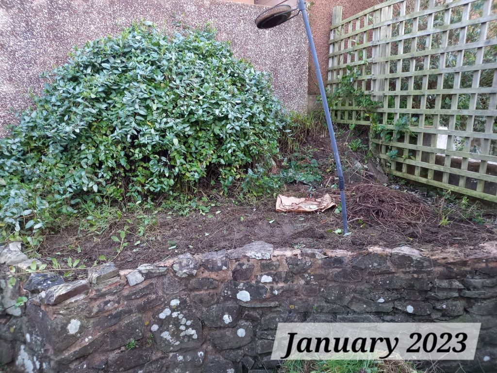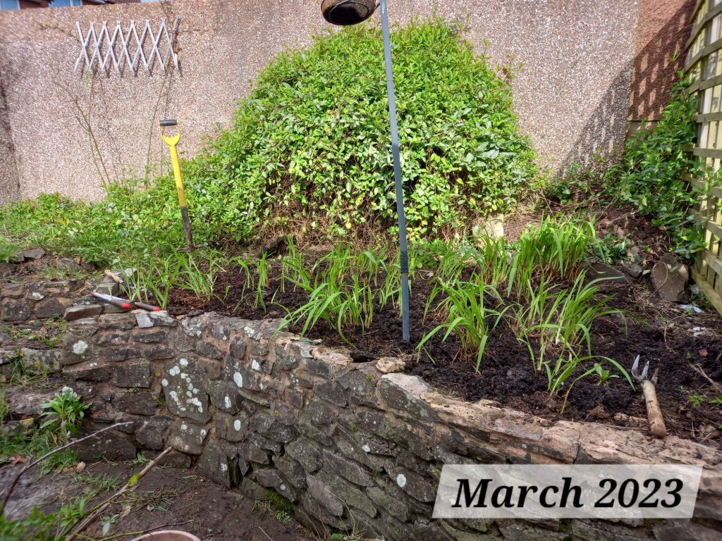 The right-side border houses our bird feeders, which are regularly visited by blue tits, green and gold finches, robins and blackbirds, along with collared doves and some rooks and starlings. The Mr and I love watching the birds from the living room window throughout the day. Before I removed the crocosmia and the honeysuckle, the Mr and I (mostly the Mr) had to wade through all the planting to get to the feeders, which was really dangerous due to the sheer drop. We have both been surprised how wide the right-hand side bed is; it is actually slightly wider than the left-side border! That means more space for plants 🙂