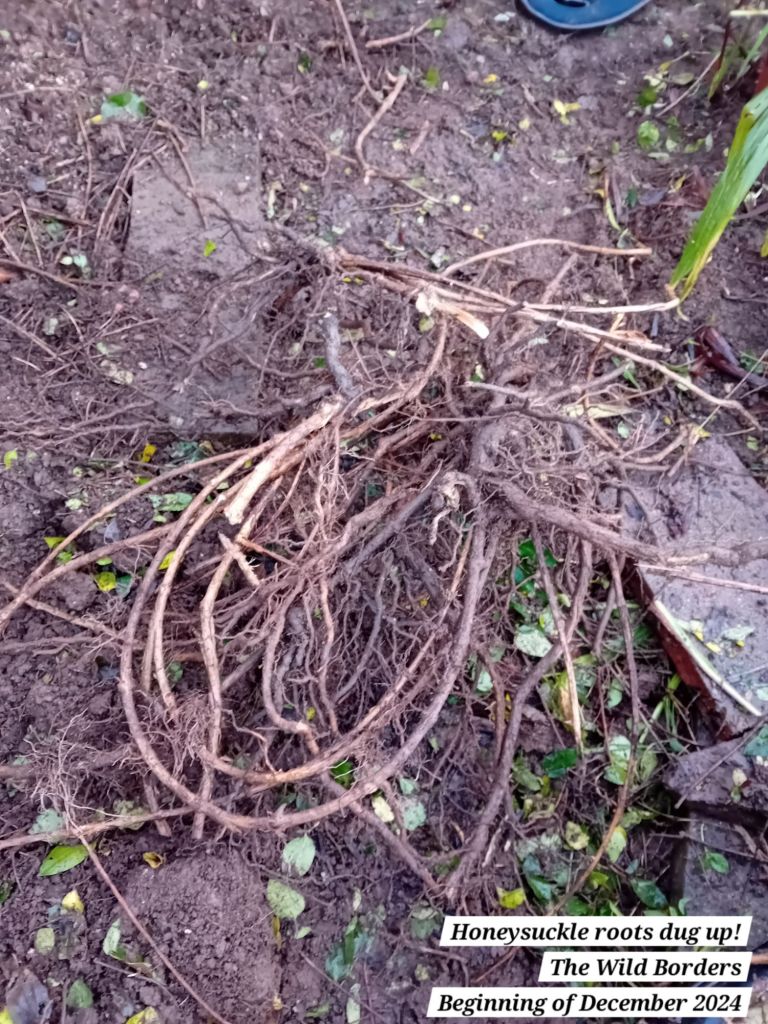 I therefore set to work this month digging up the crocosmia and the honeysuckle. This was a very muddy day! The pictures speak for themselves: