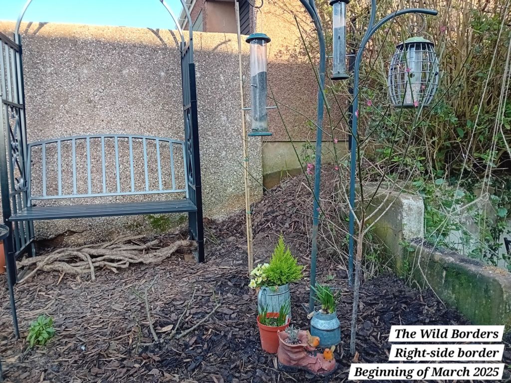 Back in December 2024, I left the right-side border like this, after removing overgrown/unwanted planting and mulching the bed: