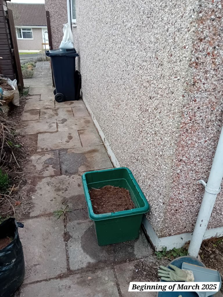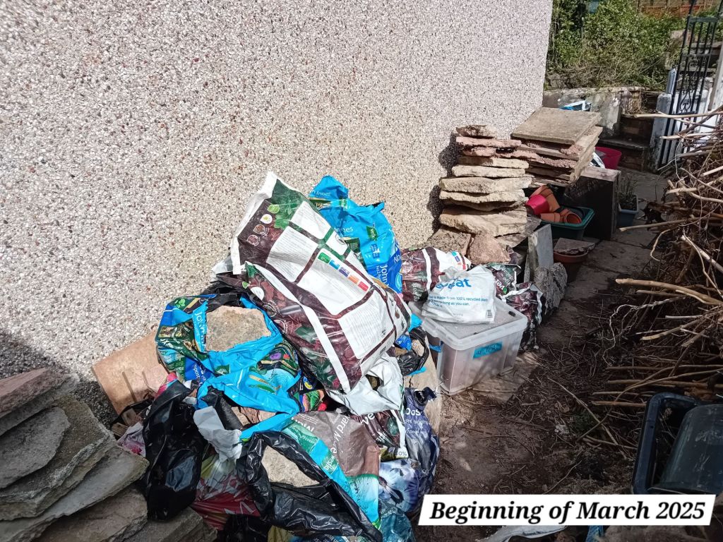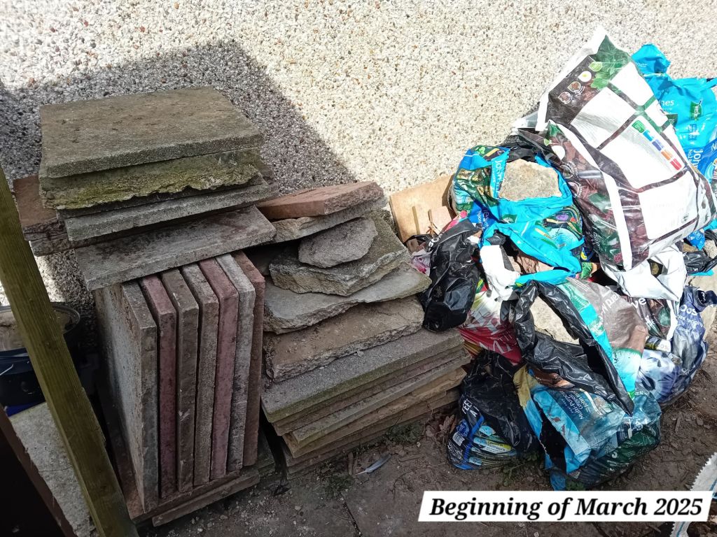 One side of our property on the outside has been used as a storage area for all the rubble and paving slabs that the Mr and I have taken up around the garden.