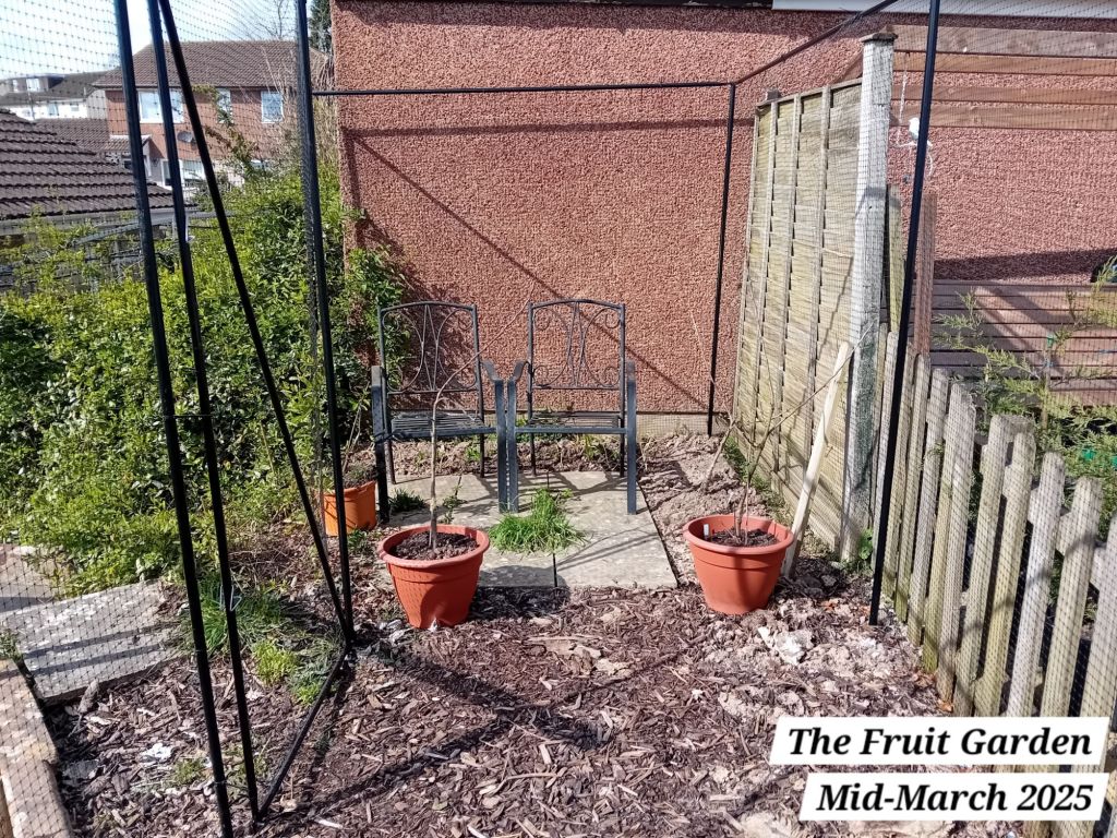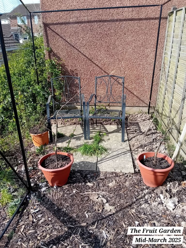 The reason why the slabs were removed is because I didn’t like how they looked off centre, when taken in the context of a new fruiting arch that is going to be put at the entrance to that little seating area. The pots in the below photo indicate roughly where I think the arch is going to be placed:
