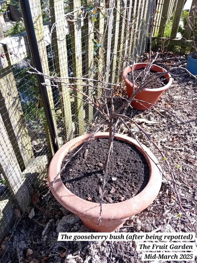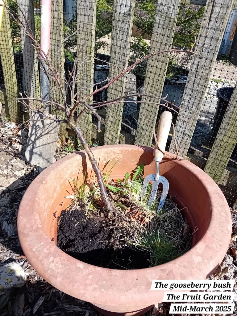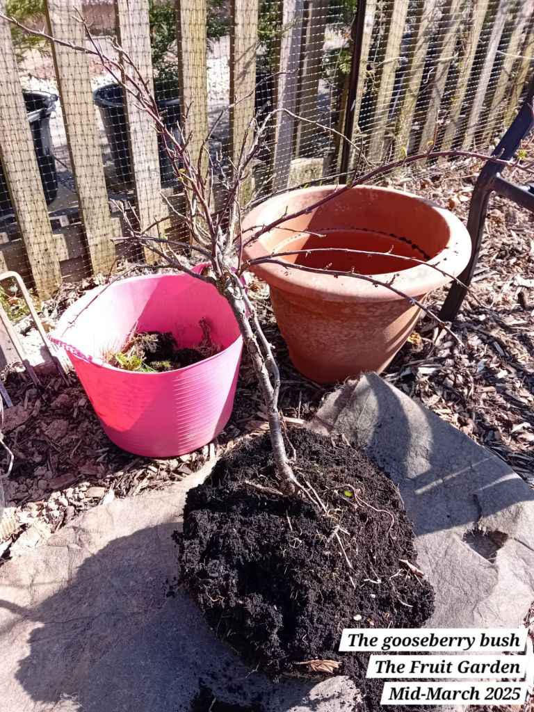 Whilst I was up in The Fruit Garden, I also repotted a gooseberry bush we inherited in this garden. It has looked barely alive for a long time and I think it has probably been left in the same pot for years: