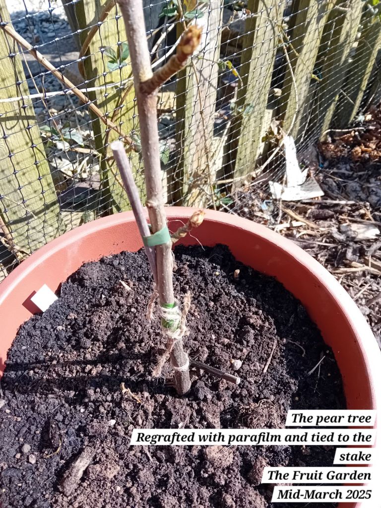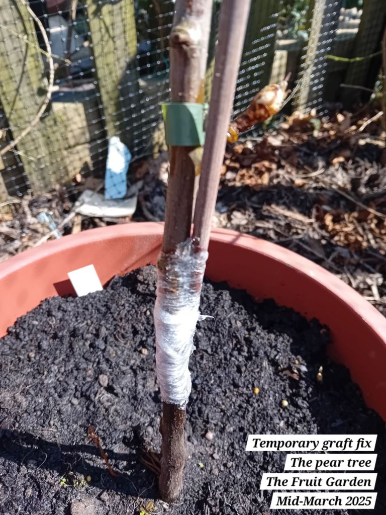 I quickly improvised that day by cutting a new graft union and fixing it together with cling film, and whilst I was in The Fruit Garden sorting out the patio area, I decided to re-do the graft union with floristry parafilm. I have used parafilm for grafting fruit trees years ago and I found it works very well.