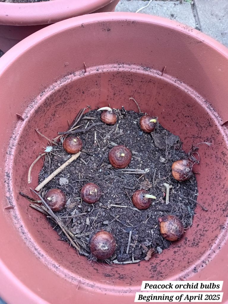 I have planted the peacock orchids in larger pots this year, to help reduce the risk of them drying out so fast. I had them in smaller pots last year and I struggled with keeping up with watering, so these larger pots should help.