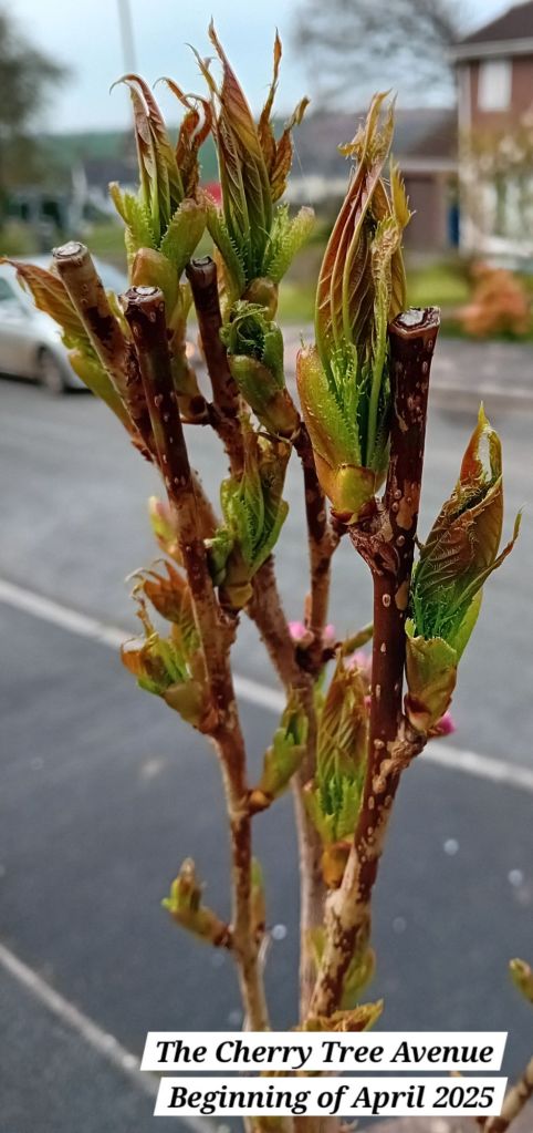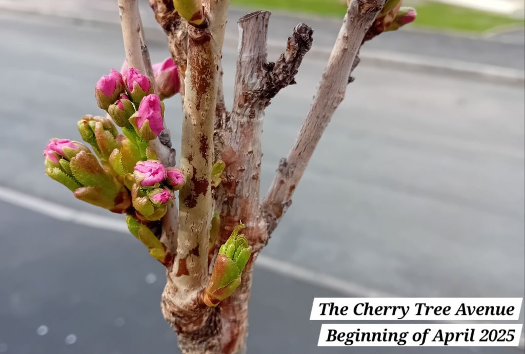 The avenue of cherry trees I planted this year in one of our front gardens is starting to show blossom buds! Here is how that avenue was looking in January 2025: