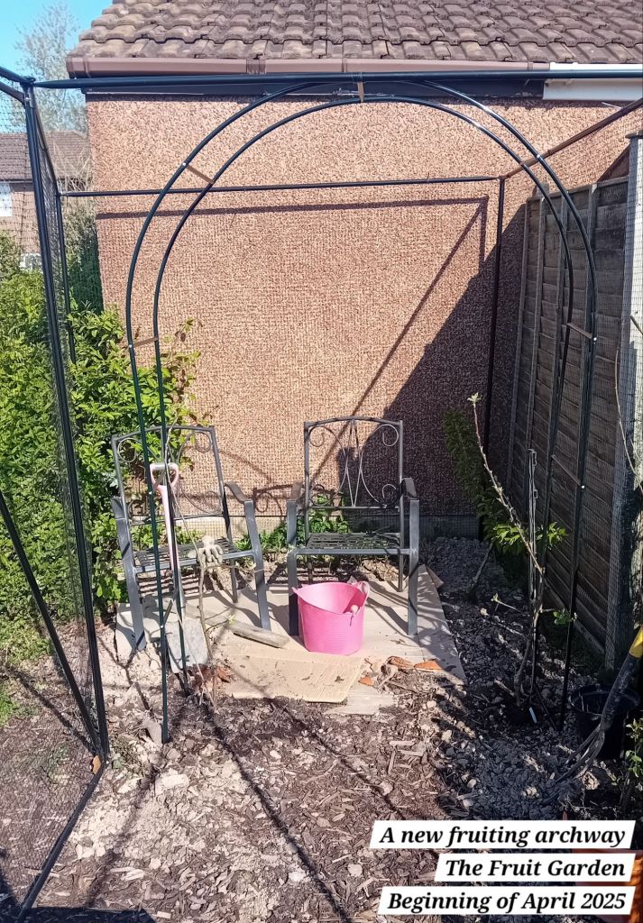 You’ll know if you read my blog, that I recently put an archway in The Fruit Garden, leading to the seating area. This arch was going to support espaliered apple trees and eventually form a fruiting archway: