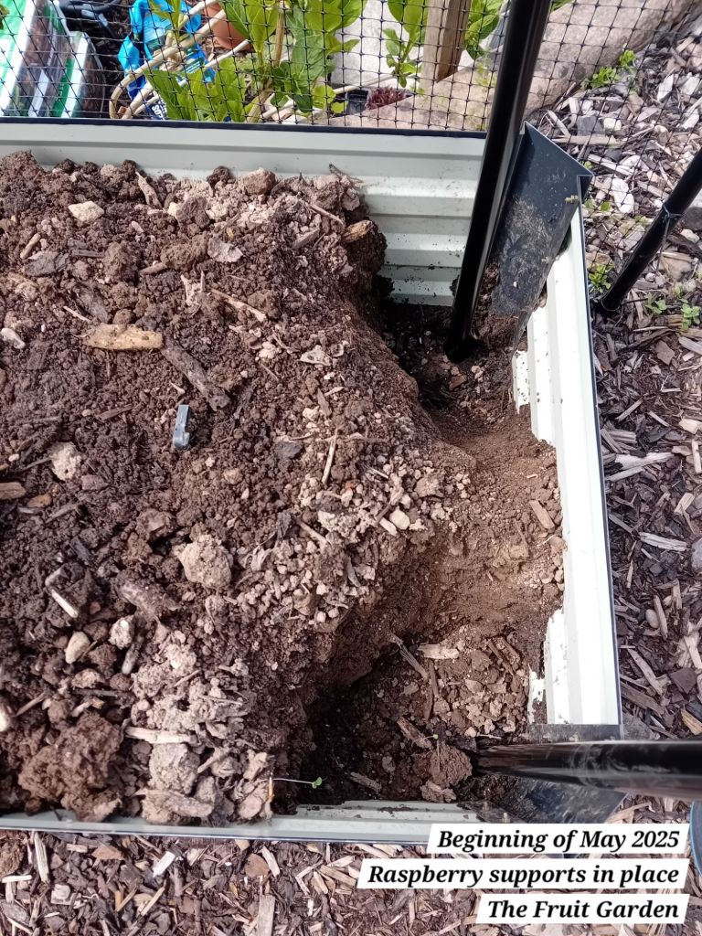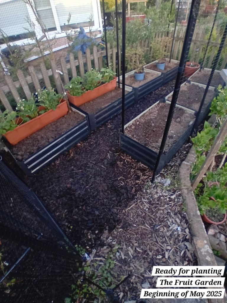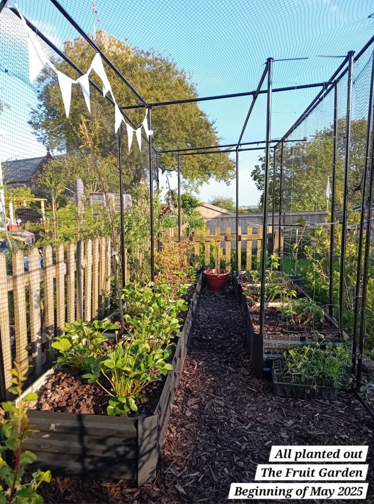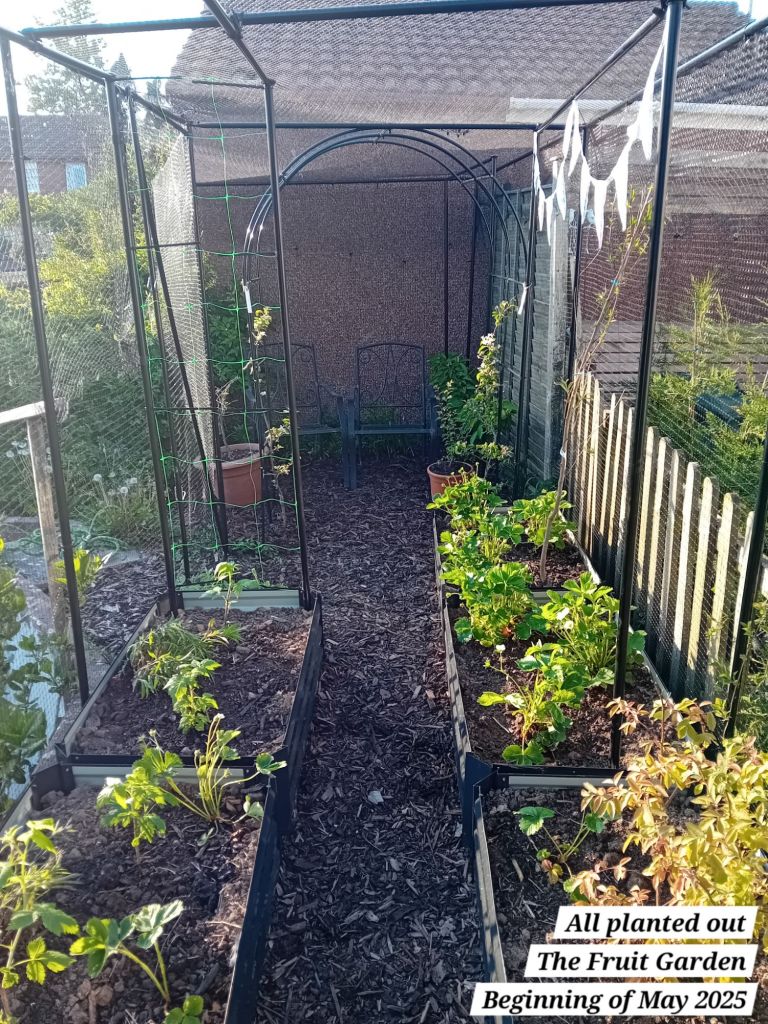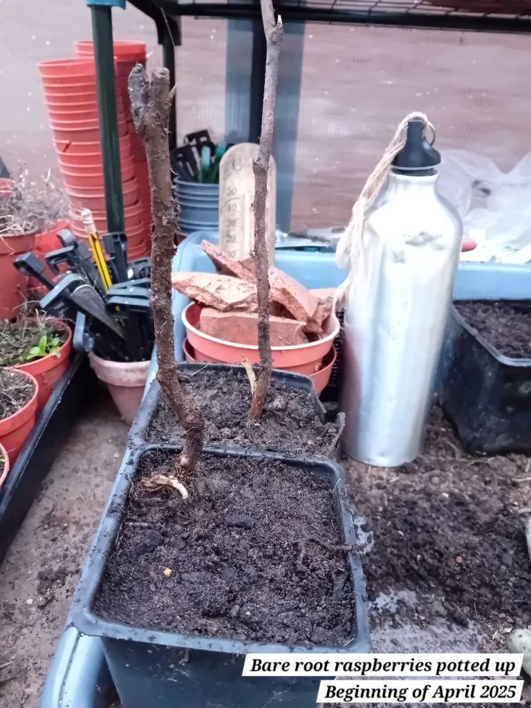 I also planted out five autumn fruiting raspberries; a well-known variety known as ‘Autumn Bliss’. I potted these as from bare root canes at the beginning of April 2025: