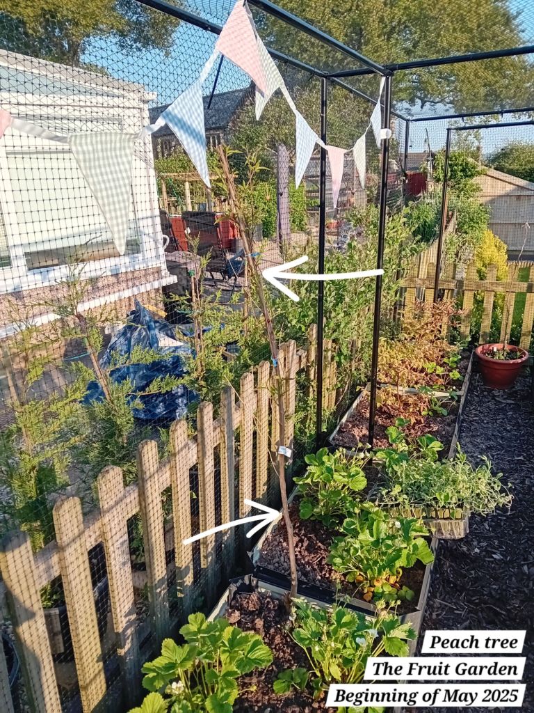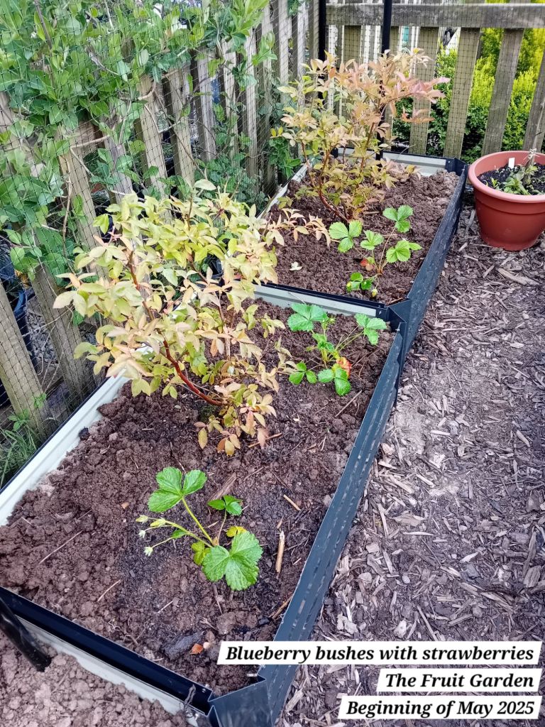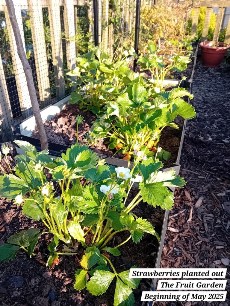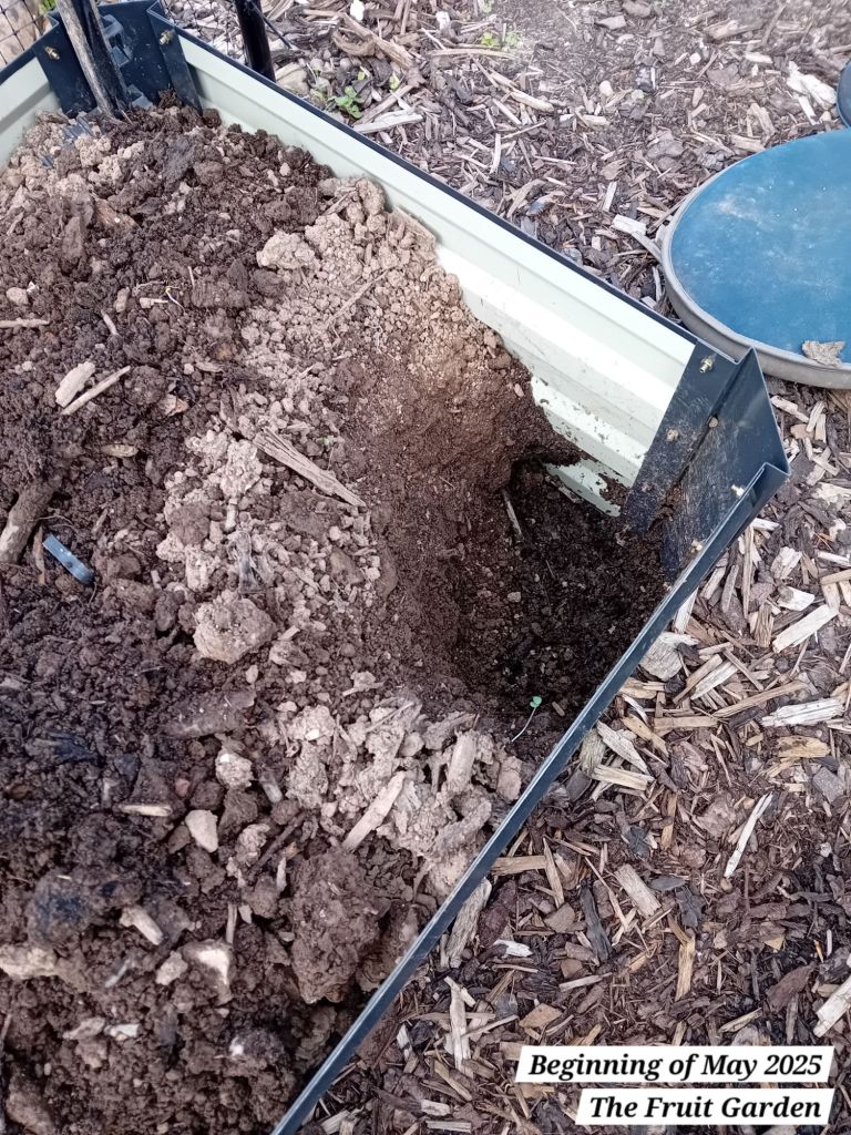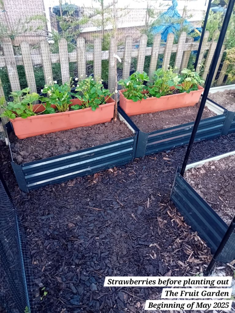 I also planted out five autumn fruiting raspberries; a well-known variety known as ‘Autumn Bliss’. I potted these as from bare root canes at the beginning of April 2025: