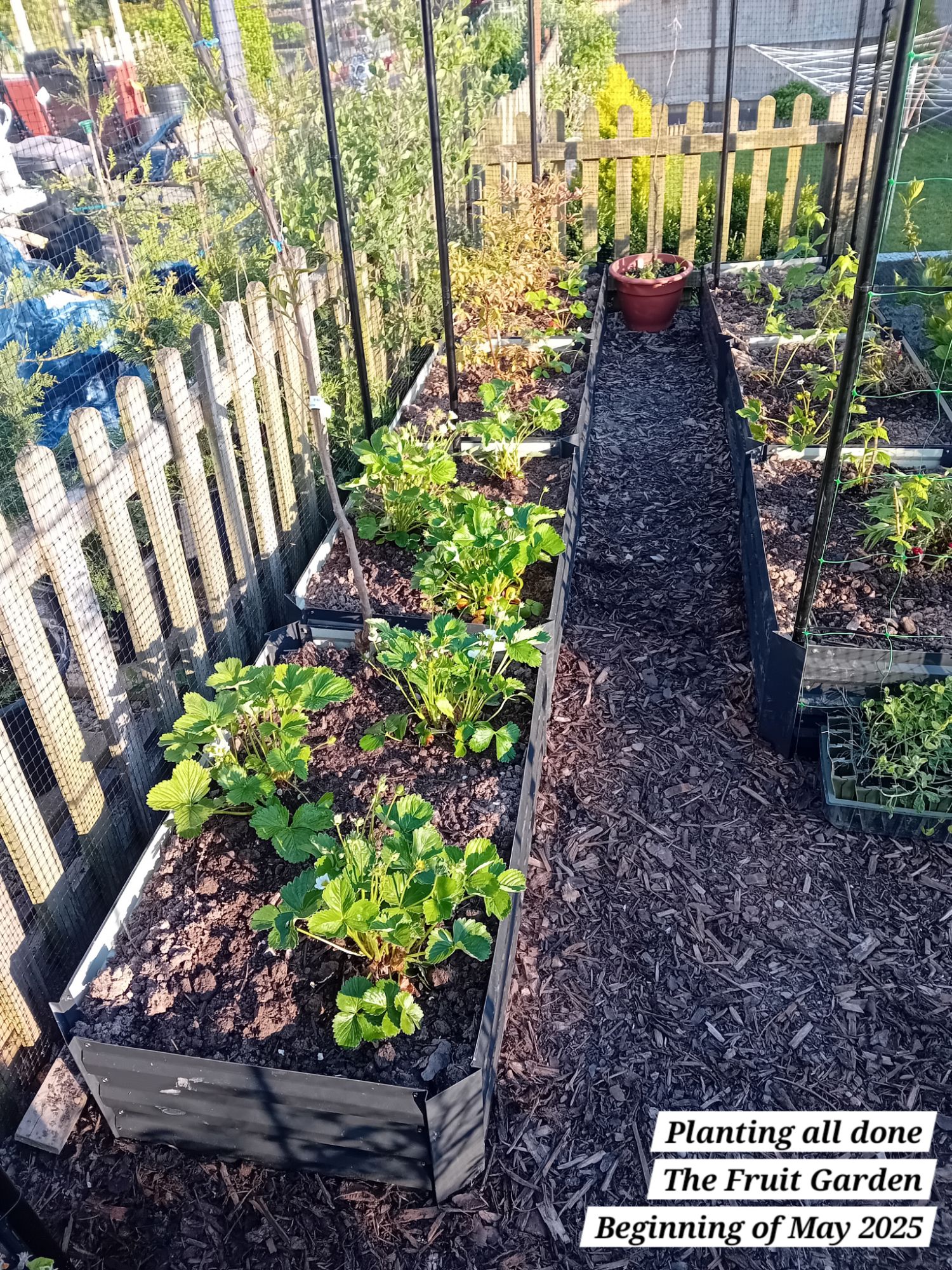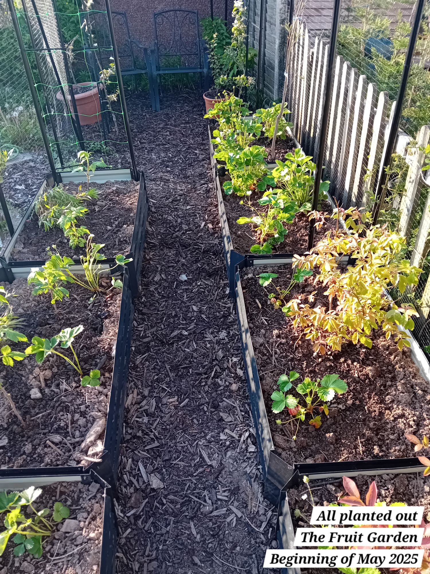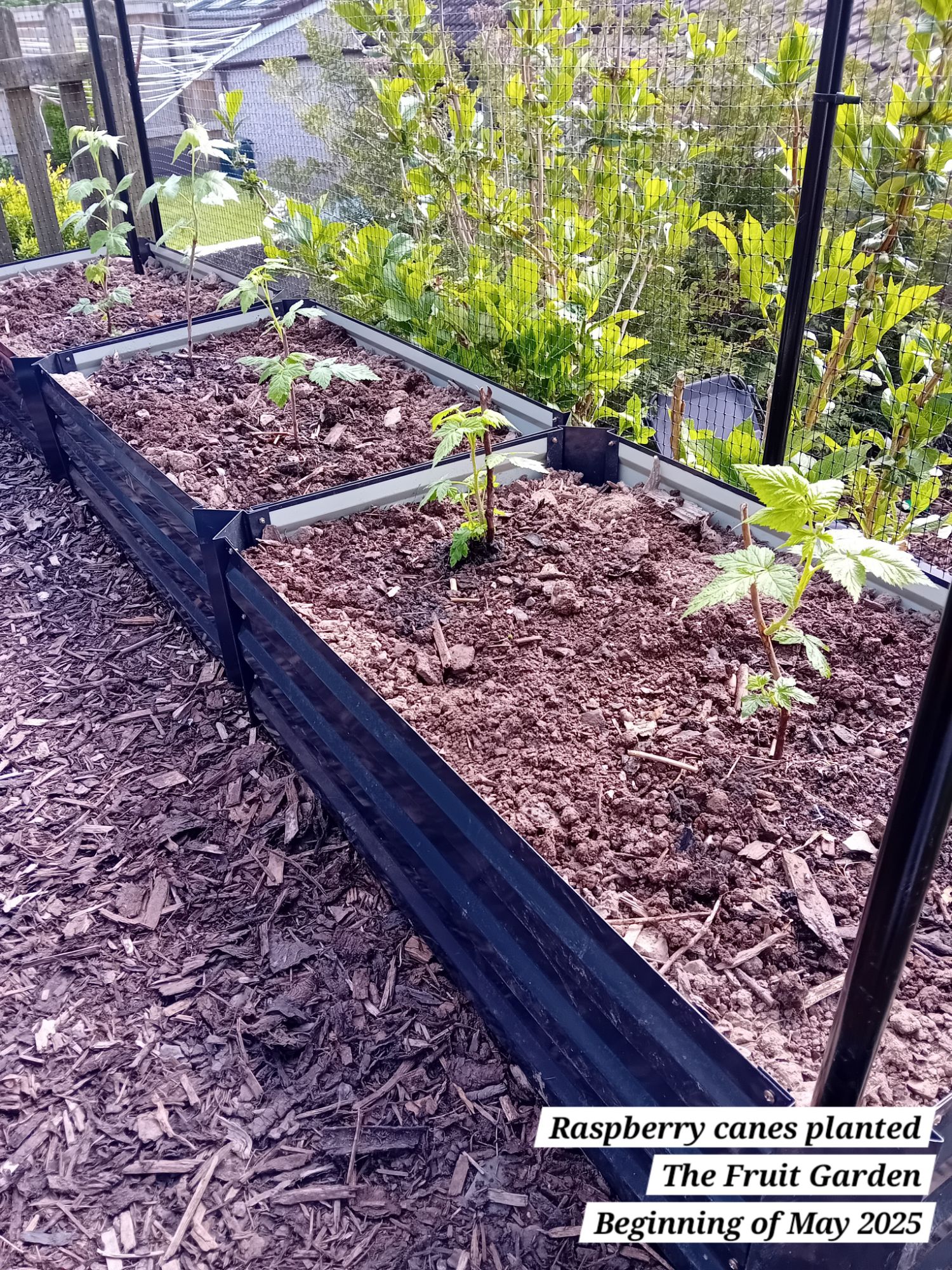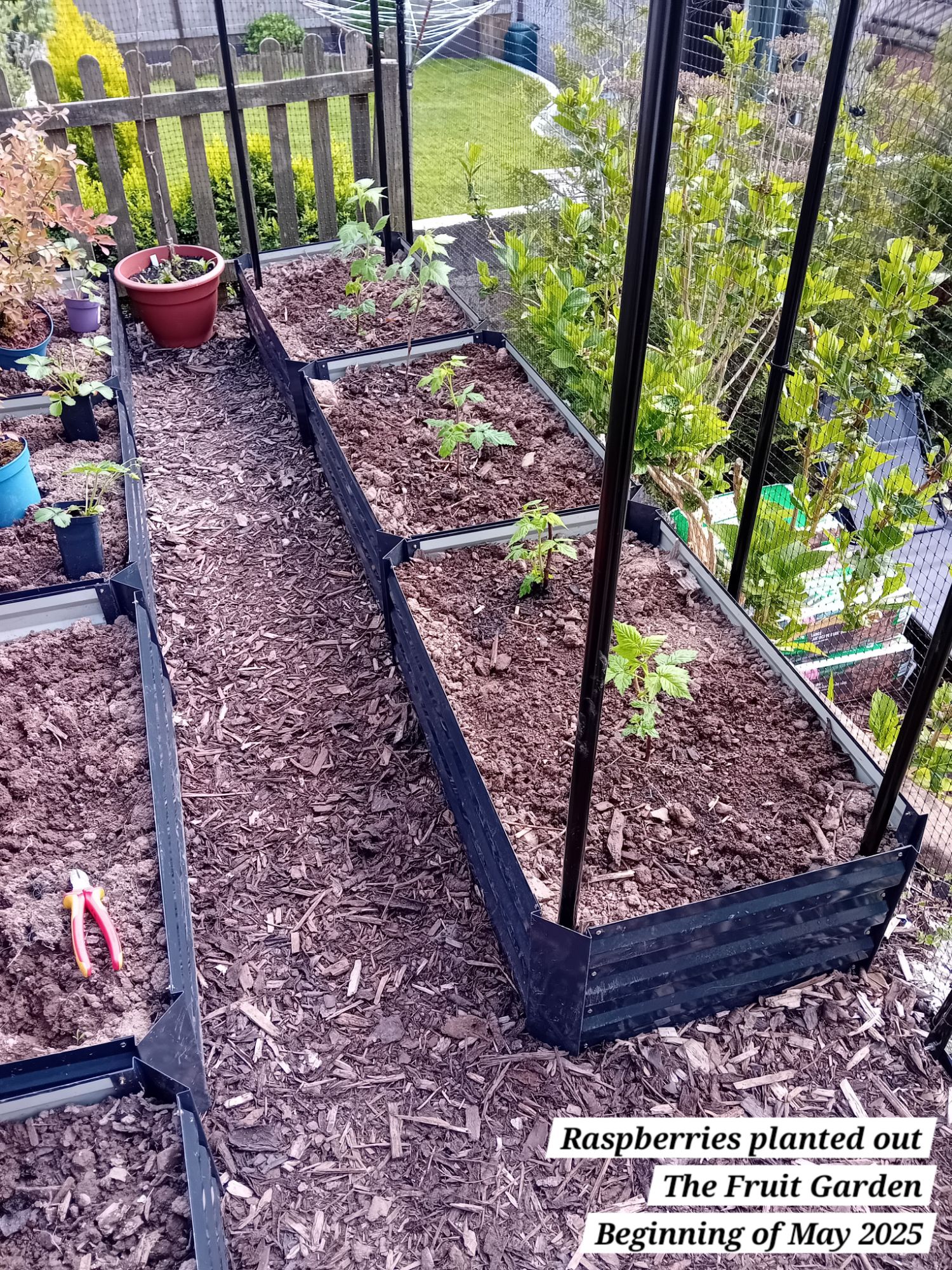 I also planted out five autumn fruiting raspberries; a well-known variety known as ‘Autumn Bliss’. I potted these as from bare root canes at the beginning of April 2025: