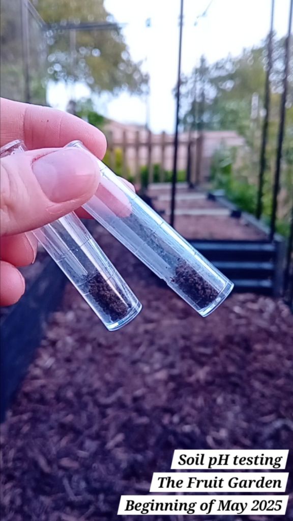 After the supports were all installed, I carried out a soil pH test to ensure that the soil in the raised beds was acidic (a video of that is available on Instagram here) The soil tested as acidic 🙂
