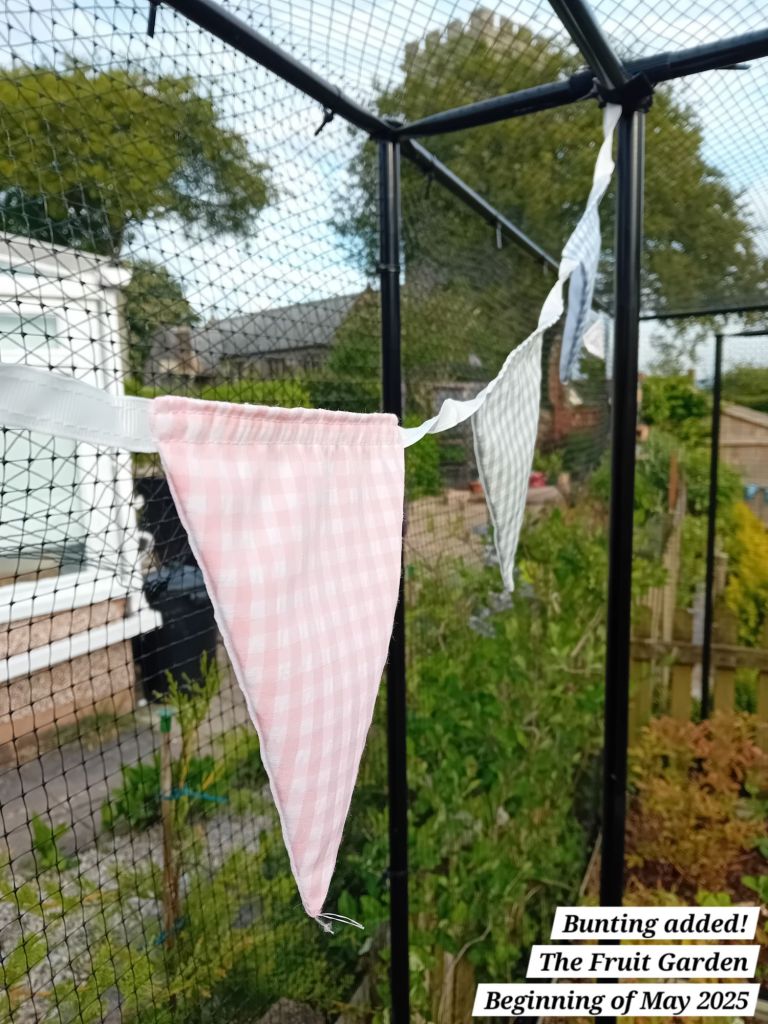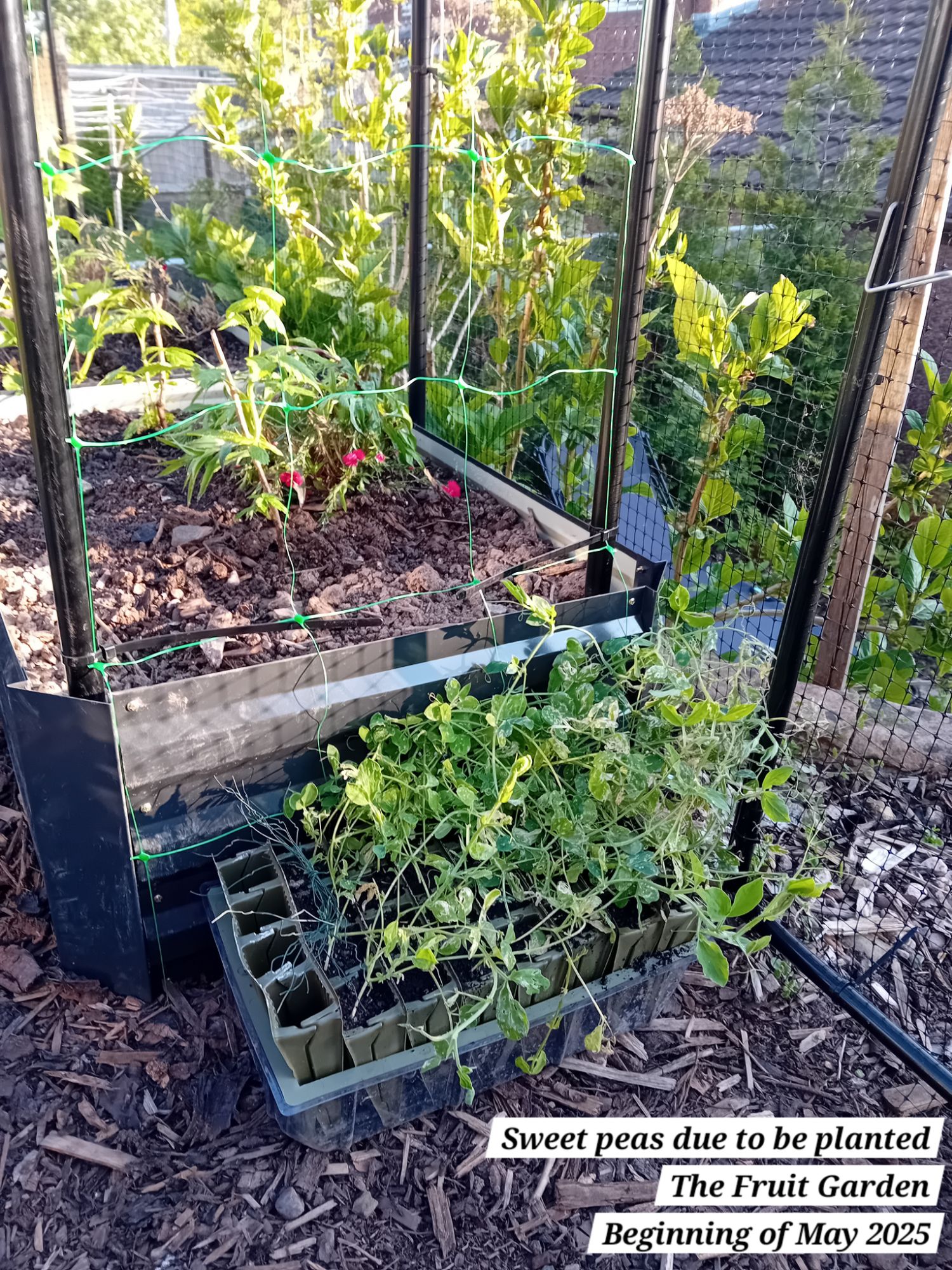 I decided I wanted to add some sweet peas to The Fruit Garden, as I have plenty that I sowed from seed this year. I added netting to the end panel of the raspberry supports, where I plan to plant out sweet peas and train them up this side: