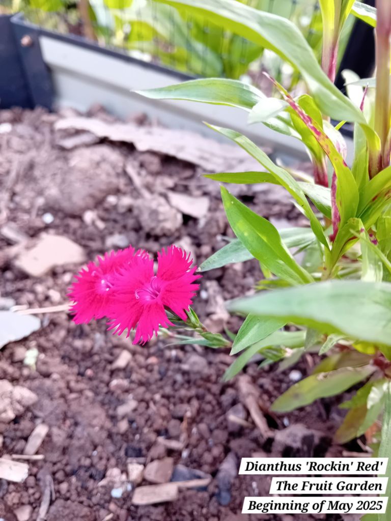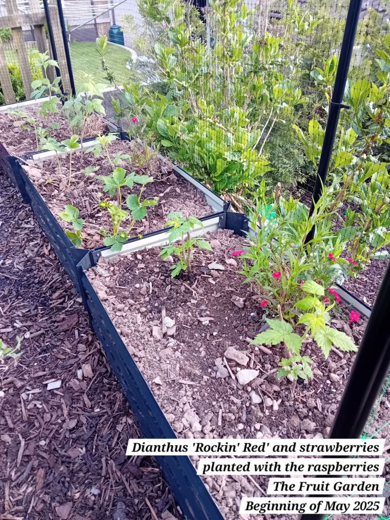 To finish off the raspberry bed (for now), I planted some strawberries and dianthus ‘Rockin’ Red’ to provide ground cover. The dianthus were growing in one of my front gardens, The Welcome Nook. I noticed that a number of these appear to have been hit by the cold Winter weather and they didn’t survive: