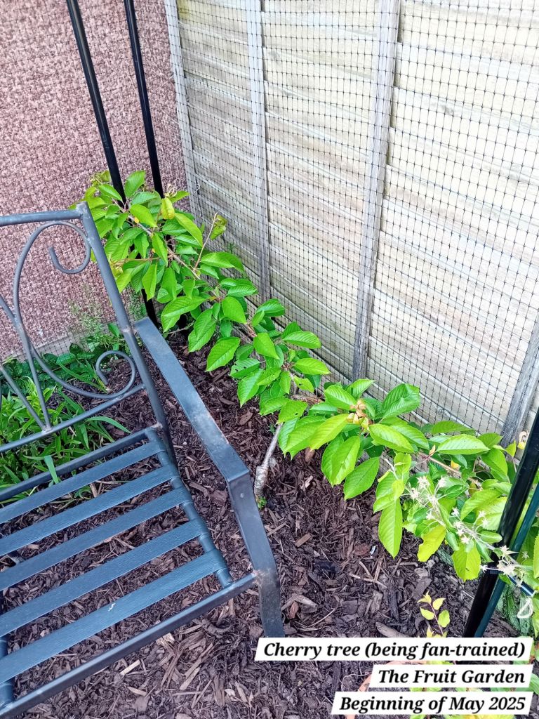 I also have the fan-trained cherry tree in that corner of the garden, that I will be growing and training further this year. Due to adding the additional archway for the apple trees, I ended up having to carefully dig up this tree too and move it slightly. This tree has supports on either side, ready for adding supports for the eventual fan shape.